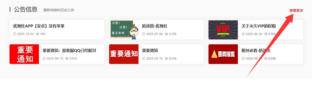 4.这里是网站的公告栏,会更新一些网站的重要信息,请多多关注 之前的信息点查看更多看图